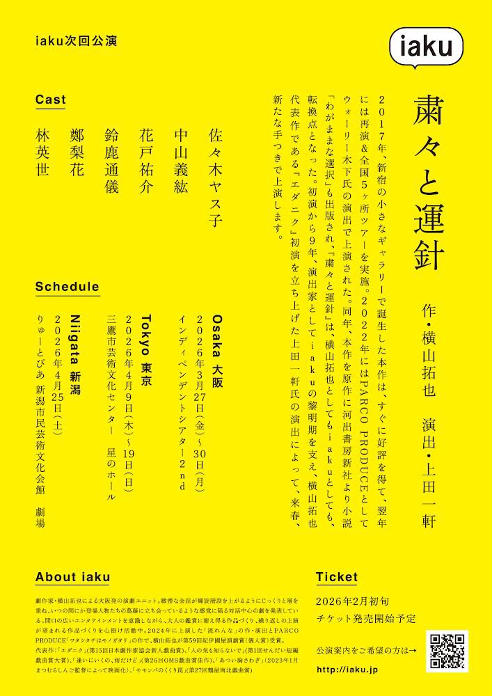 2026.3.27(金)〜4.25(土) iaku「粛々と運針」 [出演]佐々木ヤス子 【大阪】2026.3.27(金)〜3.30(月)インディペンデントシアター2nd 【東京】2026.4.9(木)~4.19(日)三鷹市芸術文化センター 星のホール 【新潟】2026.4.25(土)りゅーとぴあ新潟市民芸術文化会館 劇場